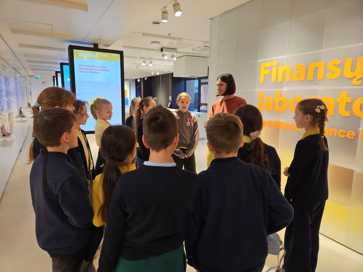 3 klasės mokinių finansinio raštingumo pamokos žinių patikrinimas vyko „Swedbanke "Finansų laboratorijoje“. “Swedbank“ "Finansų laboratorija" – tai unikali erdvė, padedanti išmaniai ir įdomiai susipažinti su pagrindinėmis ekonomikos ir asmeninių finansų valdymo temomis, suprasti, kaip planuojamas biudžetas, kodėl svarbu taupyti, ar kas yra atsakingas skolinimasis. Finansinio raštingumo informacija mokiniams buvo pateikiama pasitelkiant išmaniąsias technologijas bei žaidžiant interaktyvius žaidimus. Mokiniai ne tik įtvirtino finansinio raštingumo žinias, bet ir sužinojau naujų dalykų apie pinigus, tvarumą.